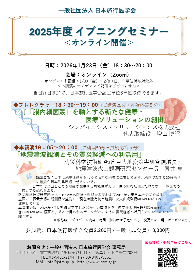 | 2026/01/23 | ━━━━━━━━━━━━━━━━━━━━━━━━━ 1月23日(金) 18:30~20:00 【6単位】 ━━━━━━━━━━━━━━━━━━━━━━━━━ ◆18:30〜19:00 プレレクチャー 『「腸内細菌叢」を軸とする新たな健康・医療ソリューションの創出』 【講師】シンバイオシス・ソリューションズ株式会社 代表取締役 増山 博昭 講演要旨:「腸内細菌叢」。それは私たちの心身の健康維持に不可欠な見えざる巨大な生態系です。そして、それは、遺伝子解析技術の長足の進歩によって、原因不明とされてきた生活習慣病など多くの疾病と関連することが明らかとなり、健康・医療の分野に残された新たなフロンティアとなっています。腸内細菌叢と疾病の関連性に関する研究と、その成果を踏まえた新たな健康・医療ソリューションの概要について解説いたします。 ◆19:05〜20:00 本講演 『地震津波観測とその震災軽減への利活用』 【講師】防災科学技術研究所 巨大地変災害研究領域長・地震津波火山観測研究センター長 青井 真 講演要旨:日本は地震活動がきわめて活発な地域に位置しており、地球で起きる20%余りの地震が日本列島周辺で起きている。日本では全国どこでも地震が発生する可能性があり、住み慣れた地元だけでなく、旅先でも被災する恐れがある。防災科学技術研究所では、1995年の阪神・淡路大震災および2011年の東日本大震災を教訓に、全国に世界最大級の観測網を整備し、現在は陸海統合地震津波火山観測網MOWLASとして運用している。本講演では、2025年7月に整備が完了したばかりの南海トラフ海底地震津波観測網N-netを含むMOWLASの概要と、そこで得られるデータがどのように震災軽減へ活用されているのかを紹介する。 ※敬称略 ※プログラム内容・時間・講演者は予定であり、変更になる場合がございます。 ―――――――――――――――――――― ●申込方法 ―――――――――――――――――――― 参加申し込み締め切り 1/21(水)正午 オンデマンド配信のみの視聴にも、参加申込が必要です。 料金は、通常参加と同様です。 *オンデマンド配信は、単位付与いたしません。 【日本旅行医学会 会員の方】 <個人会員の方> <法人会員のうち、認定資格をお持ちでマイページのある方> 会員マイページからお申し込みください ▶ 会員マイページへ *法人会員の方で、認定資格をお持ちでない(個人マイページのない)方は以下の【非会員/一部の会員の方】からお申し込みください。 【非会員/一部の会員の方】 <法人会員のうち認定資格をお持ちでない方> <複数名分お申し込み希望の会員の方> (1)以下のいずれかの口座に参加費をお振込みください。 ●三菱UFJ銀行 新宿中央支店 普通 4905050 一般社団法人日本旅行医学会 ● 郵便振替 00180-8-62898 一般社団法人 日本旅行医学会 ◆お振込先口座名義のカタカナ表記は 「シヤ)ニホンリヨコウイガクカイ」です。 (2)以下のフォームより、お申し込みください。 ▶ 【銀行振込】お申込ページ ※お振込を先にしていただき、その後申込みフォームの送信をお願い致します。お振込み日時・名義をお伺いします。 ※参加費のお振込みだけではセミナーにご参加できませんのでご注意ください。 ※参加費は、自然災害等やむを得ない場合を除き、不参加やキャンセルの場合でも返金致しかねます。予めご了承ください。 チラシはこちらからダウンロードしてください |